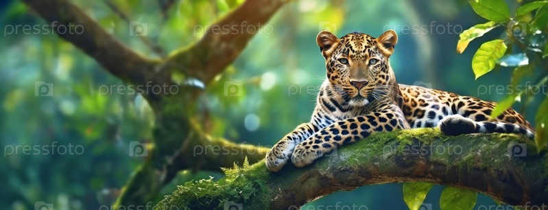 Величественный леопард, отдыхающий на ветке дерева в окружении пышного зеленого лесного листья