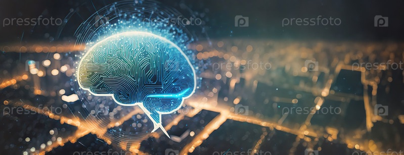 Светящаяся голограмма мозга парит над городским пейзажем ночью, представляя передовые технологии, искусственный интеллект и футуристические инновации