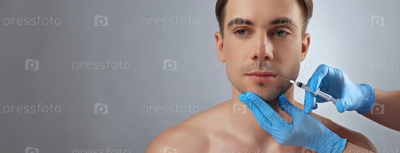 Мужчине делают косметическую инъекцию в губы, пока медицинский работник применяет лечение
