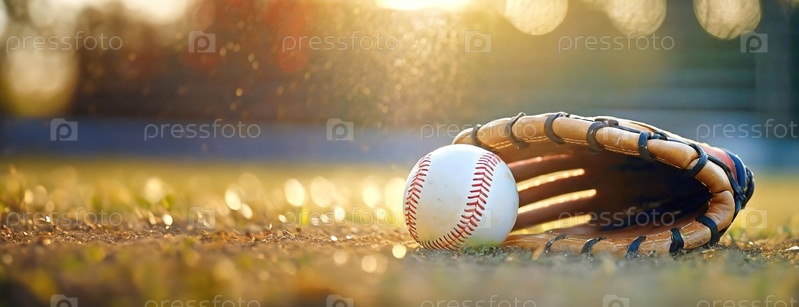 Солнечный свет освещает бейсбольную перчатку и мяч на поле. Спортивное оборудование в сумерках. Панорама с копировальным пространством