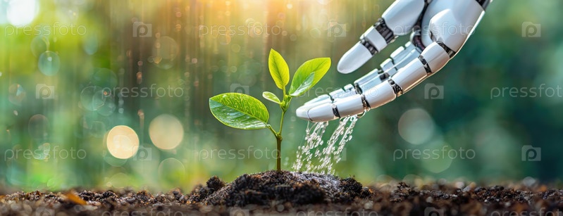 Искусственная роботизированная рука аккуратно поливает молодое зеленое растение в богатой почве, символизируя роль технологии в сельском хозяйстве с природой на заднем плане