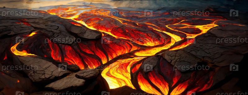 Драматическая сцена протекающей лавы с яркими оранжевыми и красными оттенками, создающая сложные узоры при движении по темной грубой поверхности