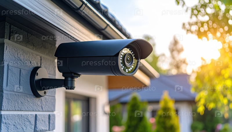 Современная камера видеонаблюдения, установленная на стене дома при закате солнца, символизирует домашнюю безопасность, тенденции наблюдения и интеллектуальные системы безопасности для жилых районов