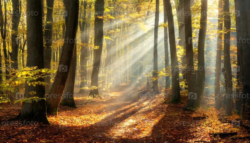 Золотой свет фильтруется через осенний лес, символизируя мир, смену сезонов, внимательность и воссоединение с природой
