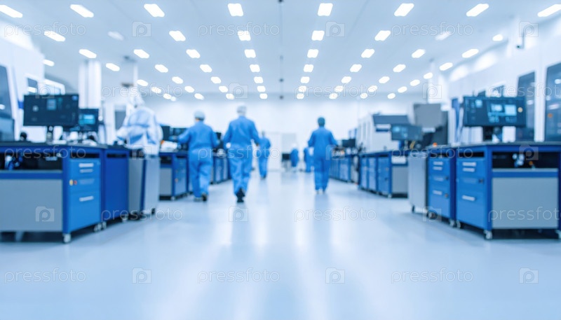 Чистая комната с рабочими в синих костюмах, представляющими высокотехнологичное производство, точную инженерию и передовые промышленные условия