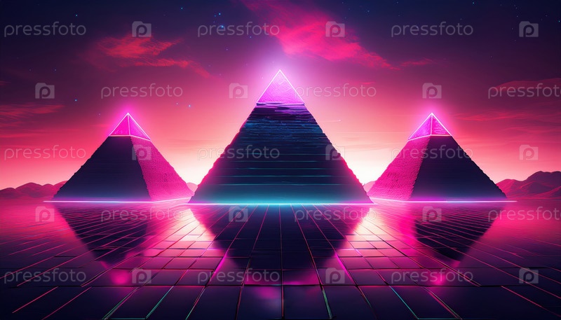 Три неоновые пирамиды, светящиеся под сумеречным небом, представляют собой футуристическую архитектуру, древнее вдохновение и цифровое искусство, сочетающее историю с эстетикой научной фантастики