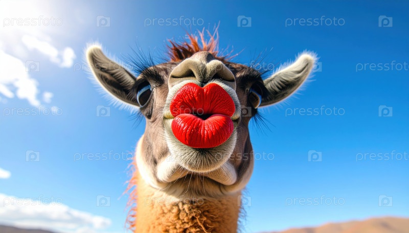 Лама с преувеличенными красными губами на фоне синего неба используется для юмористического контента, тенденций социальных сетей и игривого визуального повествования в цифровой культуре
