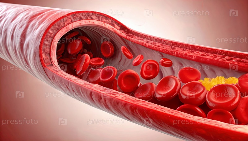 3D-картина артерии, показывающая накопление бляшек и красных кровяных клеток, символизирующие риски для здоровья, сердечно-сосудистые заболевания и важность медицинской осведомленности и образа жизни