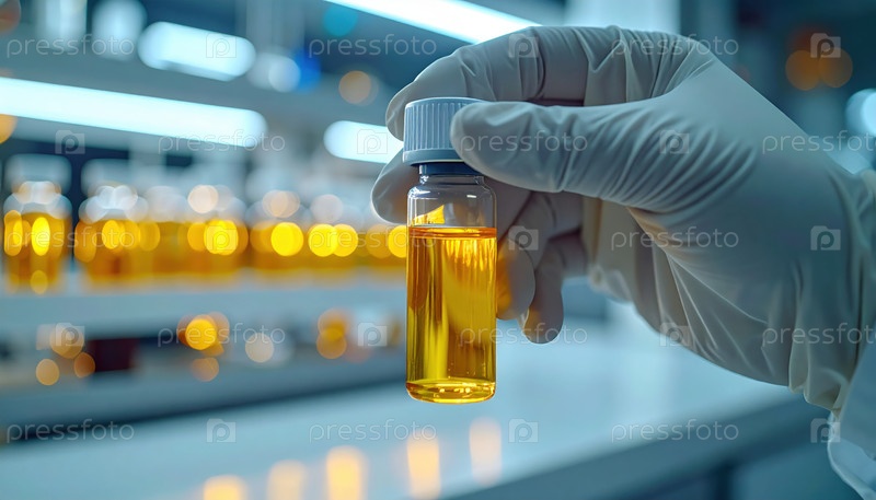 Рука в перчатке держит флакон, наполненный жидкостью из золота в современной лаборатории под искусственным освещением, демонстрируя медицинские или химические исследования в процессе
