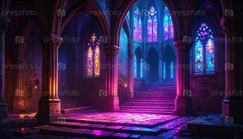 Красочный интерьер витража собора освещается яркими огнями, вызывающими духовность, готическую архитектуру и священную атмосферу