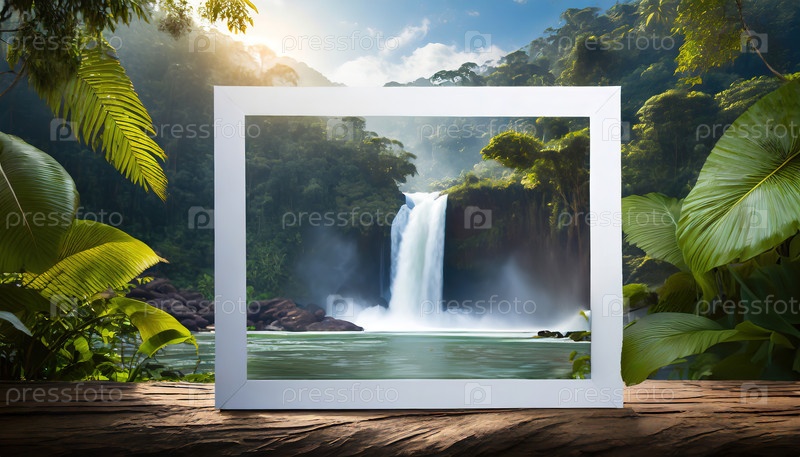 Яркий водопад, виденный через рамку картины, в окружении тропических листьев дождевого леса при теплом дневном свете