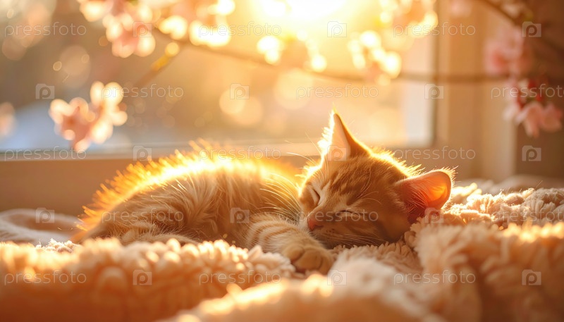 Имбирный котенок тихо спит на мягком одеяле у окна, когда золотистый солнечный свет и вишневые цветки создают мечтательную атмосферу спокойного весеннего утра