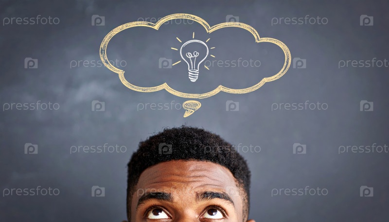 Воображаемое изображение, символизирующее рождение идеи в виде лампочки, нарисованной над головой мыслящего человека на фоне доски