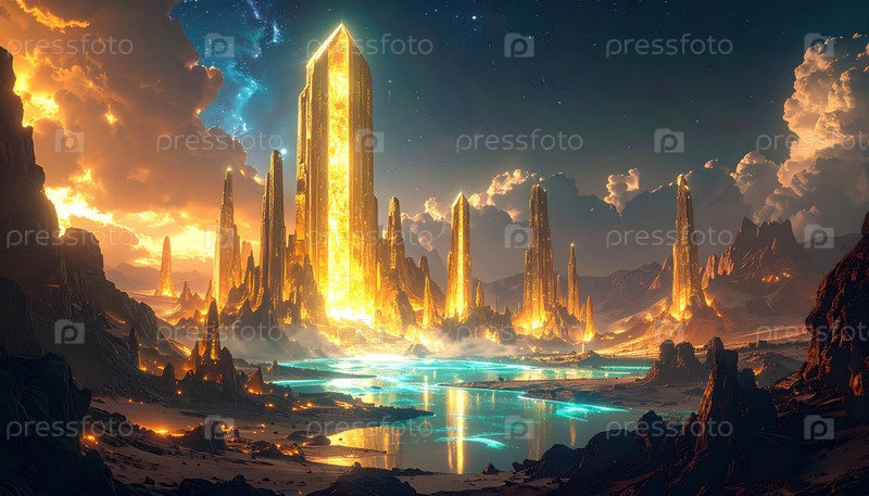 Футуристический золотой кристаллический городской пейзаж, светящийся при закате солнца, вызывает фантастические концепции построения мира для видеоигр графических романов или цифрового повествования