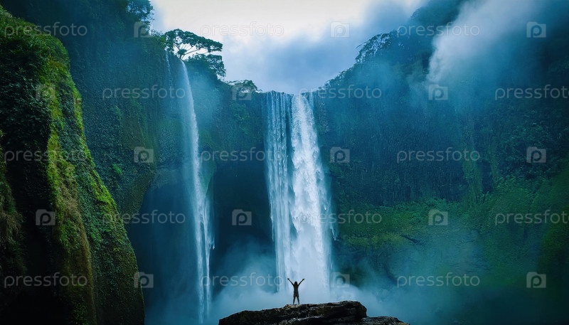 Мощный водопад каскадирует в туманный каньон с мужчиной, стоящим в страхе на скале, окруженном пышным лесом
