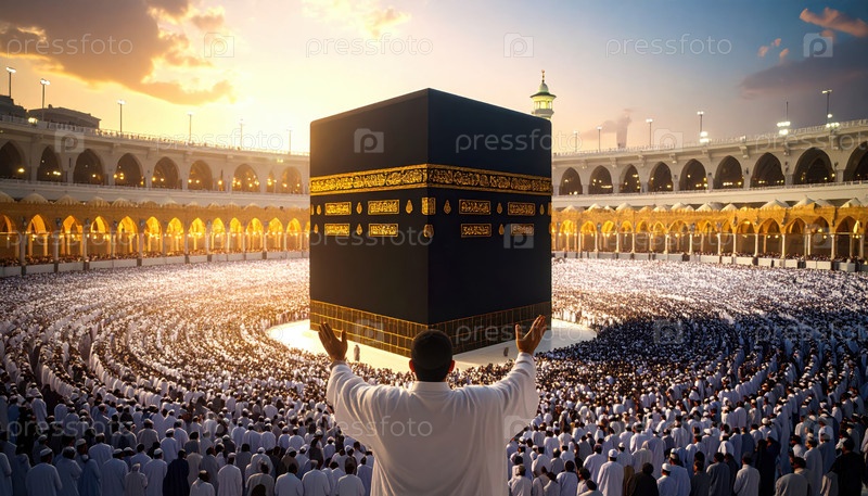 Большая толпа собирается вокруг Каабы в Мекке, представляя исламское паломничество Хадж, духовное единство, преданность и одно из ключевых ежегодных религиозных событий по всему миру