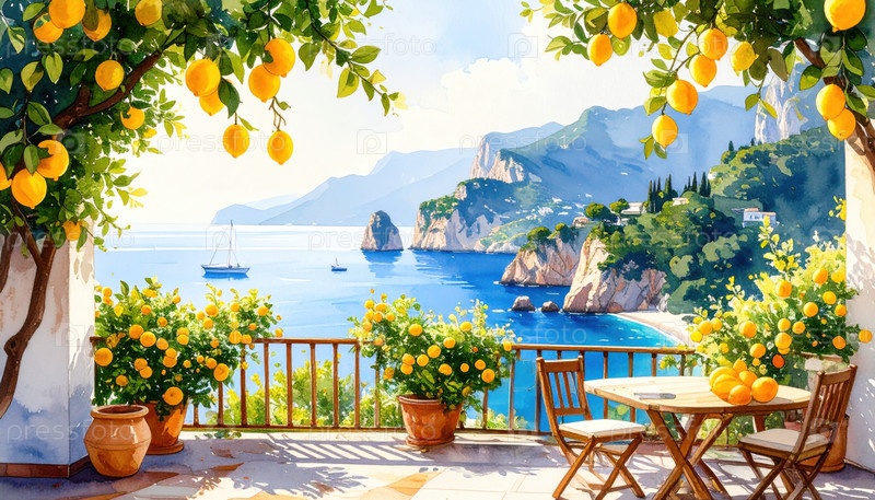 Терраса с лимонными деревьями с видом на море, представляющая средиземноморский образ жизни, летние каникулы, местную культуру питания и мечтательные места для отдыха