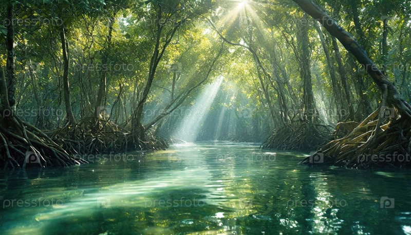 Солнечный свет течет через густой мангровый лес над спокойной рекой в тихой тропической обстановке