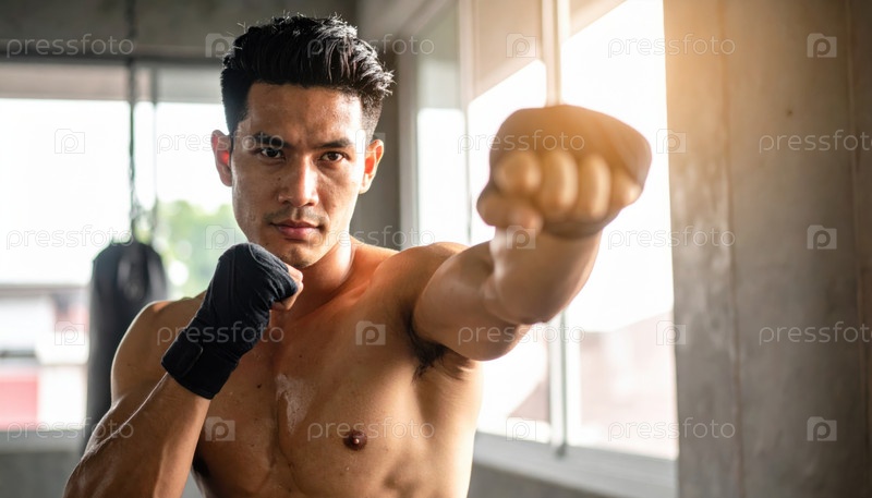 Ориентированный боевой артист в середине удара в тренажерном зале, символизирующий силу, решимость, дисциплину и стремление к совершенству в фитнесе или боевых видах спорта