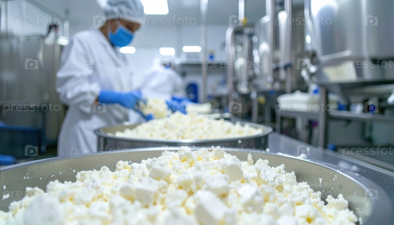 Пищевые специалисты на молочном заводе обрабатывают свежий сыр с коттеджным сыром, делая акцент на производстве продуктов питания, гигиене и современных молочных технологиях