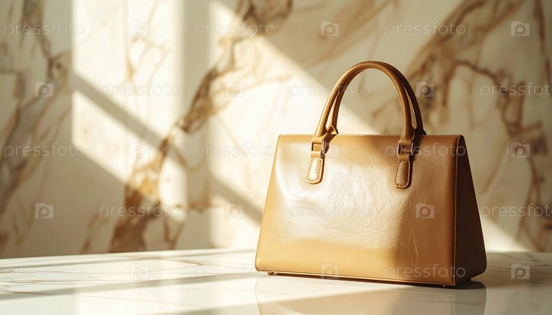 Стильная кожаная сумочка сидит на мраморной поверхности, купающейся в теплом естественном свете, символизируя роскошную моду и элегантные аксессуары
