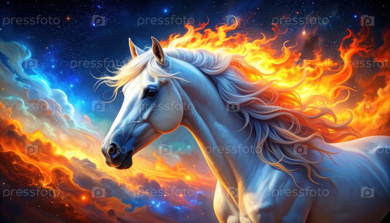 Белый конь с горящей гривой галопирует по космическому ландшафту, символизируя силу, дух и свободу