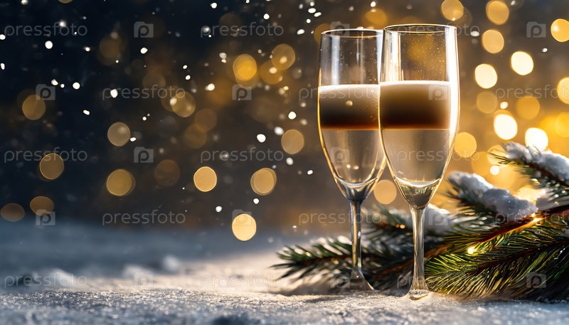 Две флейты шампанского, расположенные в снегу с сосновыми ветвями и боке на заднем плане, фиксируют праздничную атмосферу