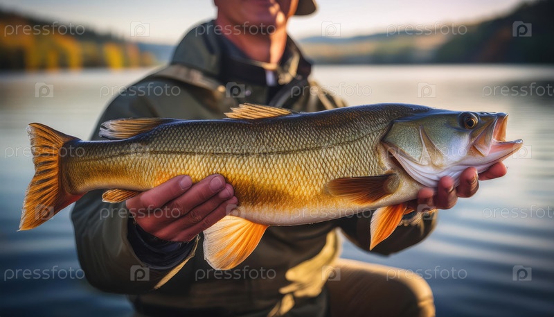Рыбак держит в руках большую золотую рыбку, только что пойманную на спокойном озере, захваченной мягким вечерним светом