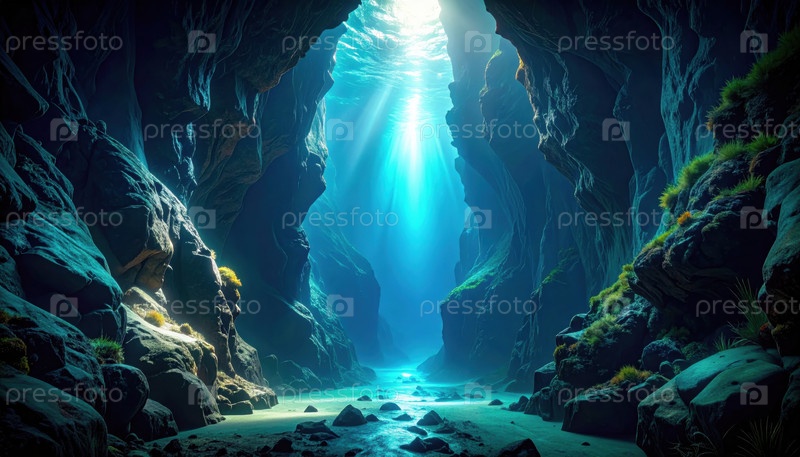 Подводный каньон с солнечным светом, пронизывающим воду, символизирующий исследование, скрытые чудеса, морскую тайну или природную красоту в глубинах океана