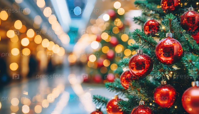Рождественская елка с красными украшениями в яркой интерьерной обстановке, с теплыми огнями боке на заднем плане