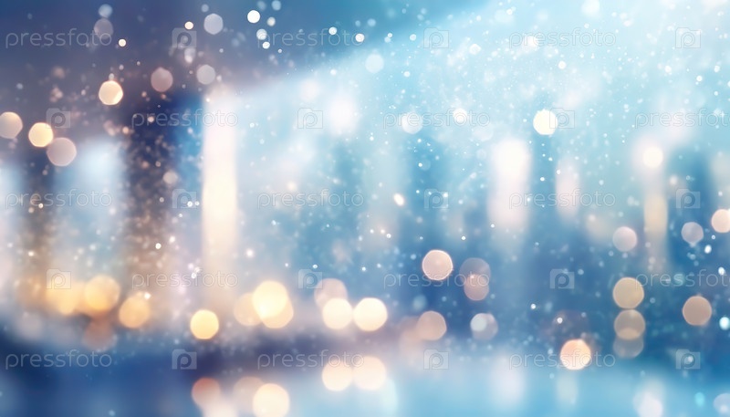 Сказочная снежная сцена с нежно светящимися городскими огнями и снегопадом, создавая волшебную зимнюю атмосферу