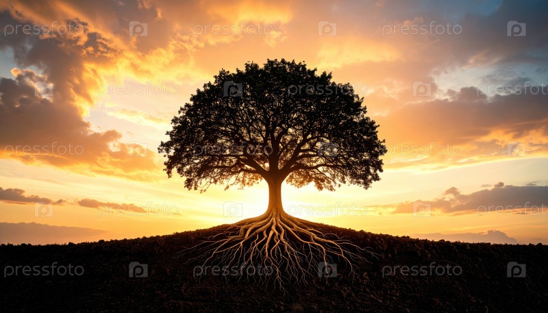 Одинокое дерево с видимыми корнями на закате солнца символизирует фундамент, рост, наследие и силу в духовном или экологическом контексте