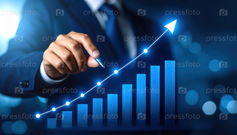 Концепция успеха цифрового бизнеса показывает руку, рисующую светящийся вверх финансовый график, отражающий рост и прибыльность