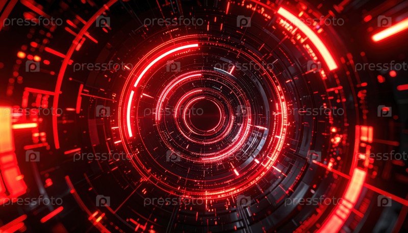 Футуристический красный цифровой тоннель, наполненный голографическими элементами и светящимися неоновыми схемами, представляющими передовые технологии и киберпространство