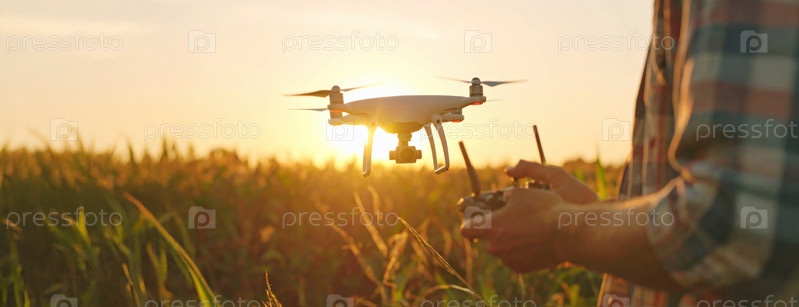 Беспилотный полет над сельскохозяйственными угодьями в сумерках символизирует точное земледелие, техническое сельское хозяйство и интеллектуальные решения для устойчивого производства продуктов питания