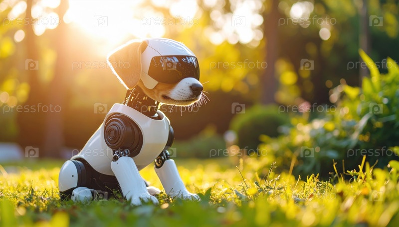 Роботизированная собака в солнцезащитном парке символизирует связь между технологией и природой, внедряя технологии домашних животных и искусственного интеллекта в повседневную жизнь