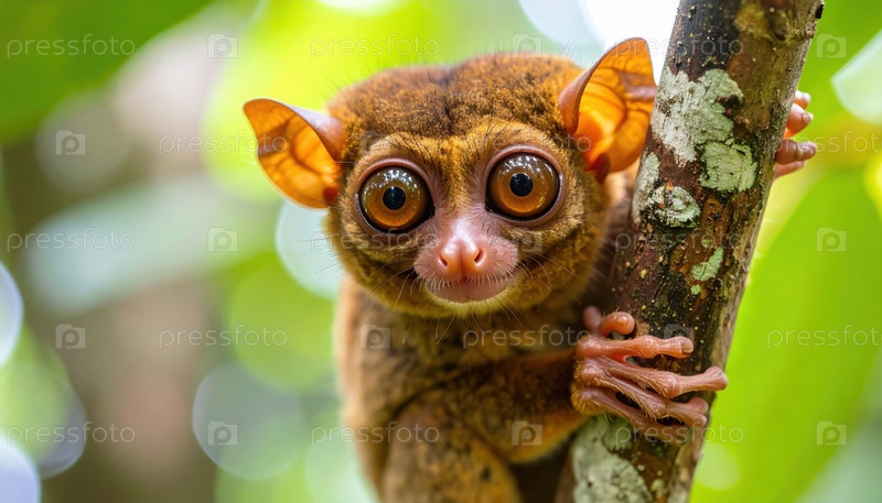 Широкоглазый тарсир захватывает дерево, замерзшее от любопытства под джунглями