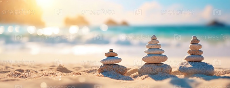 Зен-камни в сбалансированных ядрах на тропическом пляже на рассвете.Гармония и мир резонируют, когда каменные башни стоят против яркого неба
