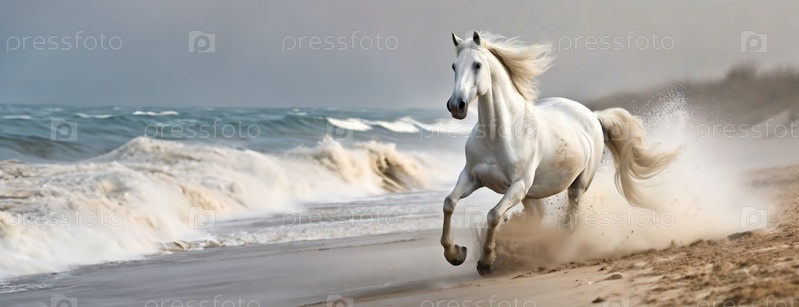 Величественный белый конь галопирует вдоль берега, океанские волны разрываются позади. Мощная грация животного на песчаном пляже. Фональная информация с копировальным пространством. Свобода и дикий дух природы. Панорама