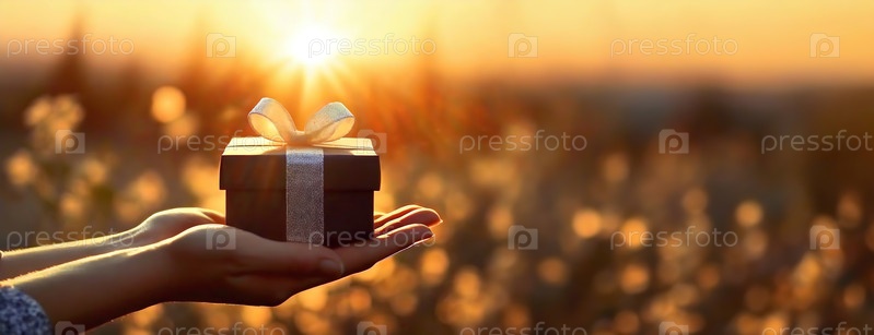 Рука, держащая коробку с подарками на закате солнца как подарочный жест