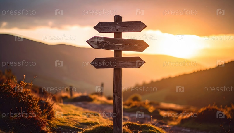Деревянный указатель направления в живописном горном пейзаже во время заката, представляющий выбор, решения о путешествии, исследование и направление жизни