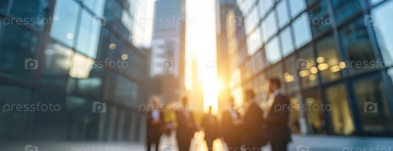 Размытый вид бизнес-профессионалов, стоящих в городском ландшафте, купающихся в теплом золотом солнечном свете, символизирующем инновации и будущий рост, панорама с копировальным пространством, фон