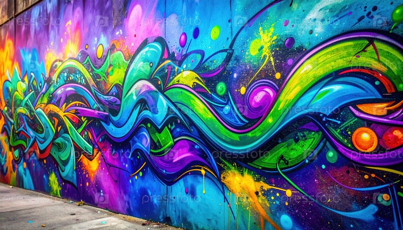 Красочные граффити на стене города, символизирующие городское самовыражение, культуру уличного искусства, творчество и голос современной молодежи