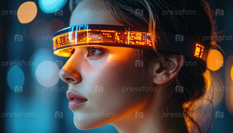 Женщина в футуристическом светодиодном визите, окруженная неоновыми огнями в киберпанк-стиле