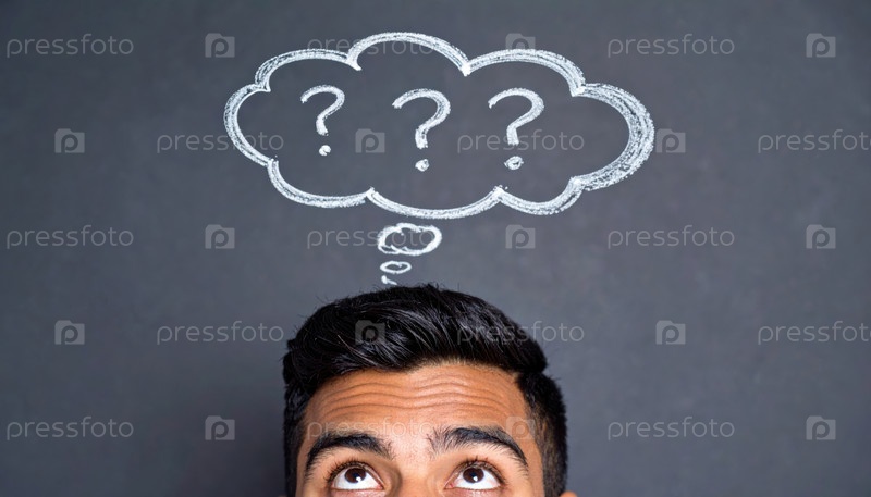 Человек смотрит вверх с пузырем мыслей, полным вопросительных знаков, иллюстрирующих любопытство, замешательство, мозговой штурм или поиск решений и инновационных идей