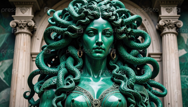 Скульптура Медузы, сделанная из зеленого камня со змеями вместо волос на фоне древних архитектурных колонн