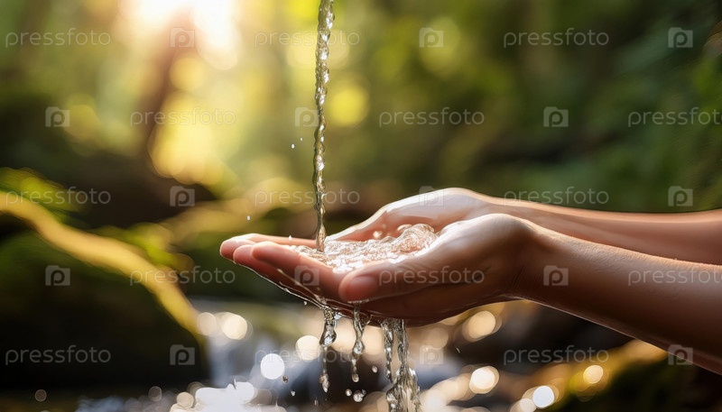 Руки держатся вместе, ловя свежую текучую воду из естественного ручья в солнечном лесу