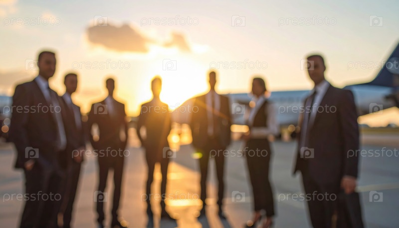 Силуетированные бизнесмены собираются возле частного самолета на закате, предлагая служебные поездки высокого уровня или глобальную корпоративную мобильность