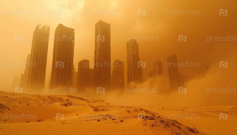 Заброшенные небоскребы нависают над пустынным пейзажем под сильной песчаной бурей на антиутопической городской сцене днем