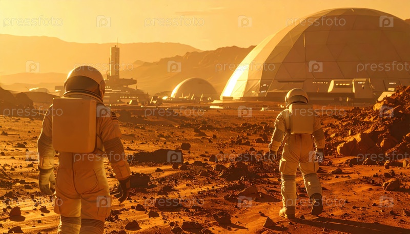 Астронавты исследуют футуристическую колониальную базу на поверхности Марса во время захода солнца